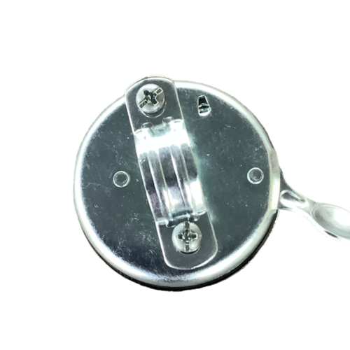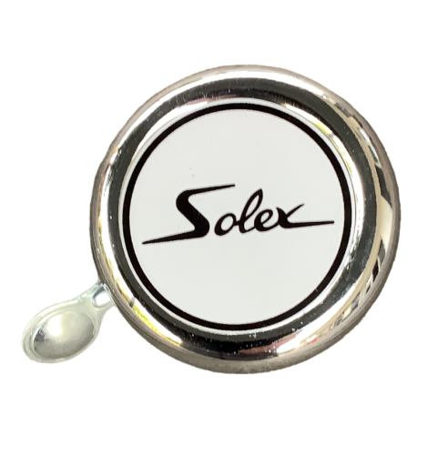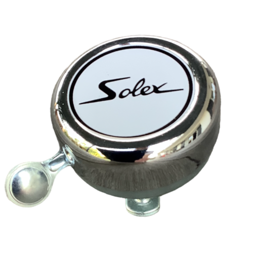 Sonnette chromé avec inscription SOLEX sur le dessus avec fond blanc.