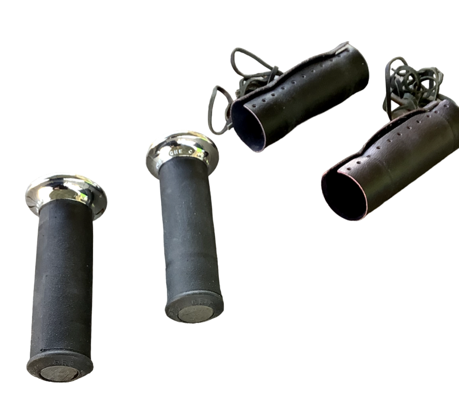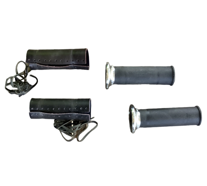 Poignées en caoutchouc avec embouts chromés accompagné de 2 couvres poignées en cuir et ses 2 lacets.