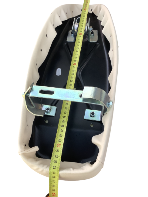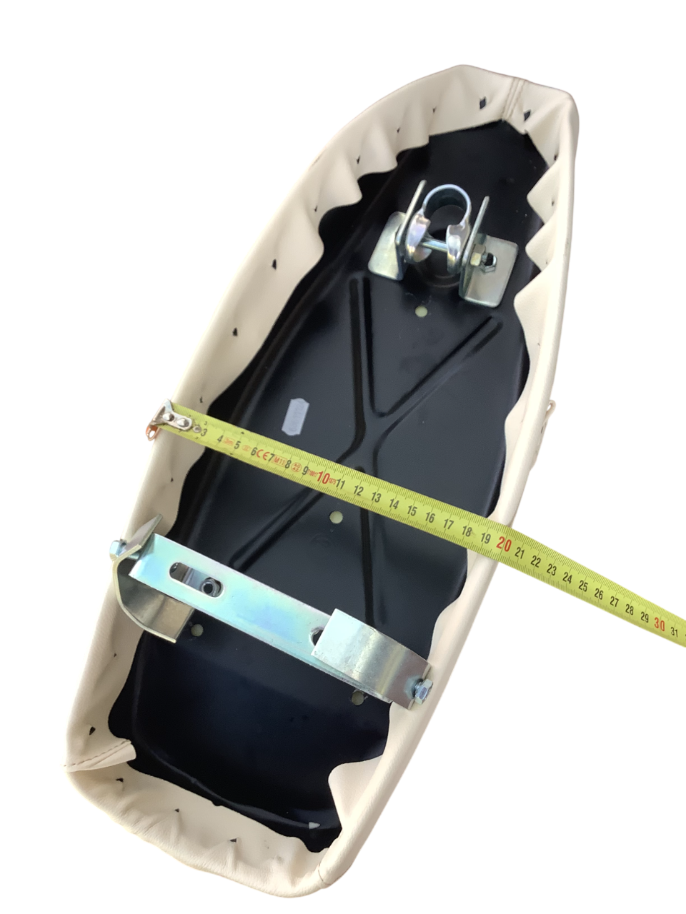 Selle biplace beige cyclomoteur Peugeot MBK Motobécane tube 26 mm, selle vintage blanc cassé avec sangle, selle biplace skaï cyclo support inclus.