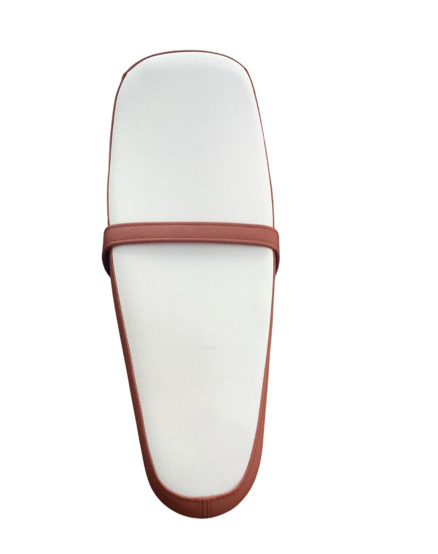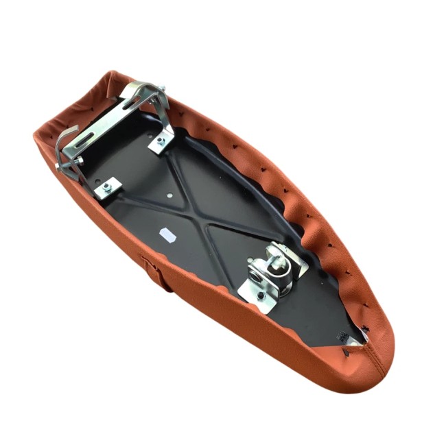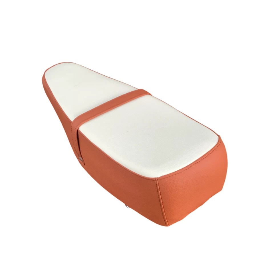 Cette selle est proposée en finition bicolore beige (blanc cassé) et marron, avec sangle centrale assortie, apportant une touche élégante et authentique à votre cyclomoteur.