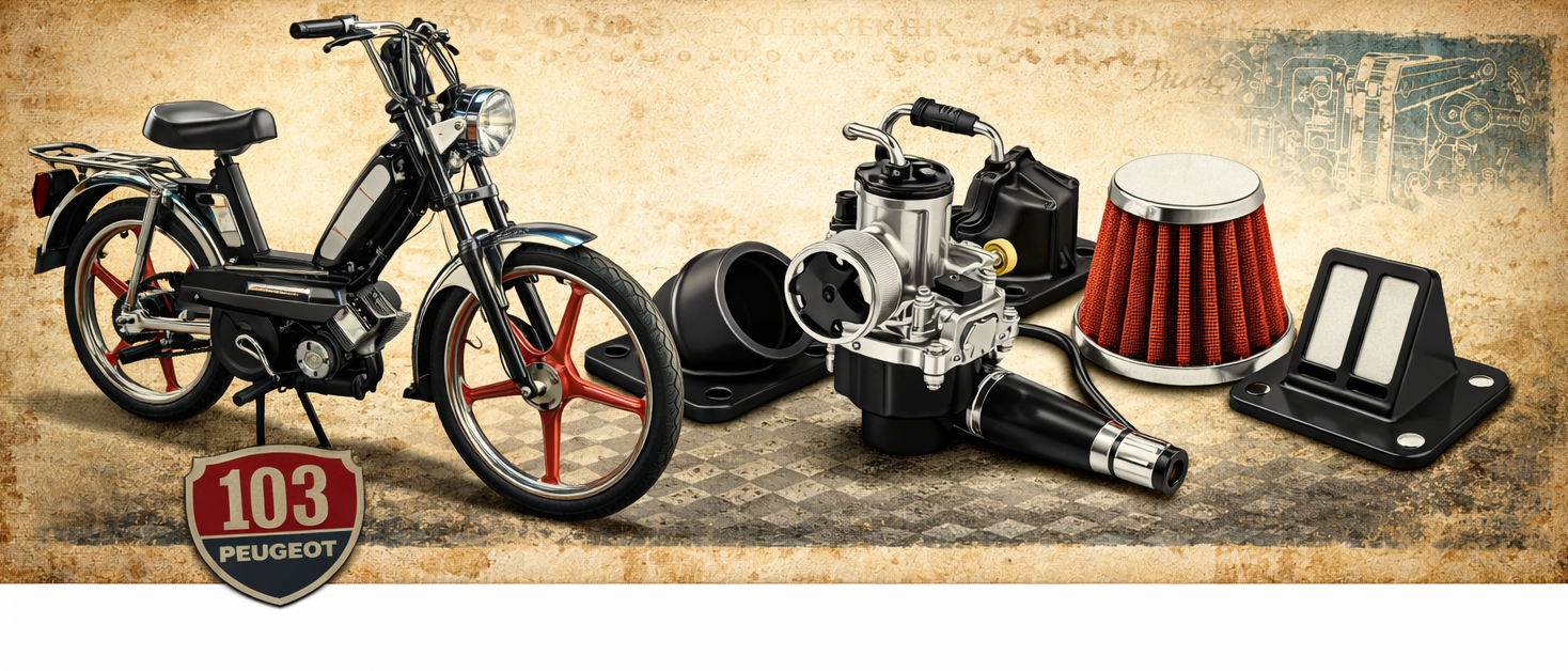 Vous trouverez ici toutes les pièces d’admission compatibles avec les Peugeot 103 SP, MVL, Vogue, RCX, SPX et modèles équivalents : pipes d’admission, clapets, carburateurs, manchons, joints, cales isolantes et accessoires de montage.